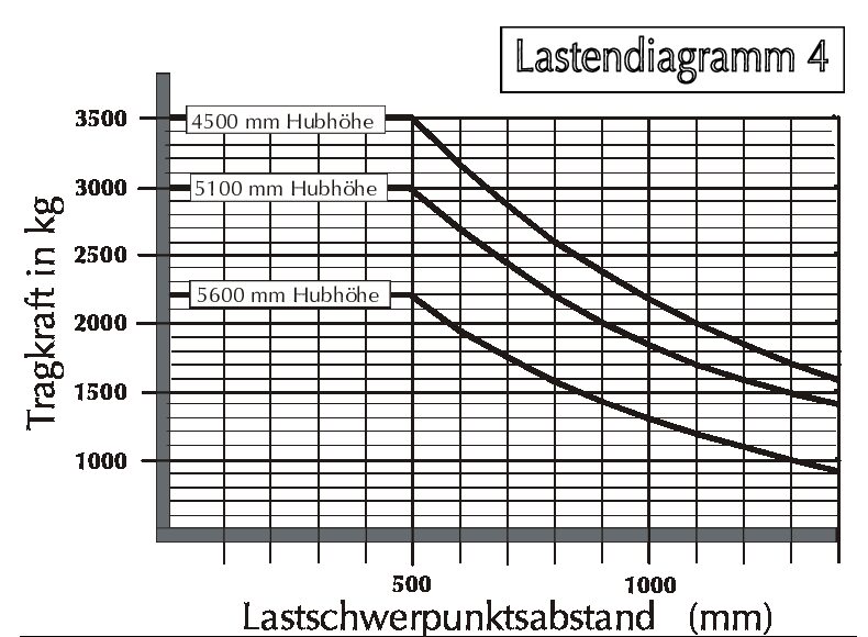 Diagramm 4 unterscheidet sich nur optisch von Diagramm 3. Die Unterschiede: Höhenbegrenzungslinien sind nicht linear, sondern als Kurve dargestellt. Es gibt mehr Werte für Tragfähigkeit und Lastschwerpunktabstand - hier dürfen alle Linien verwendet werden (man zählt selbst in Schritten von 100). Der Vorgang zum Ablesen der Werte bleibt exakt wie bei Diagramm 3.
